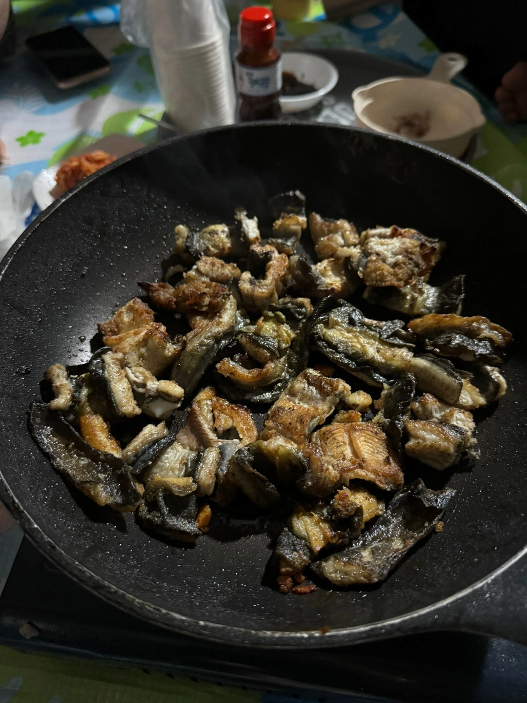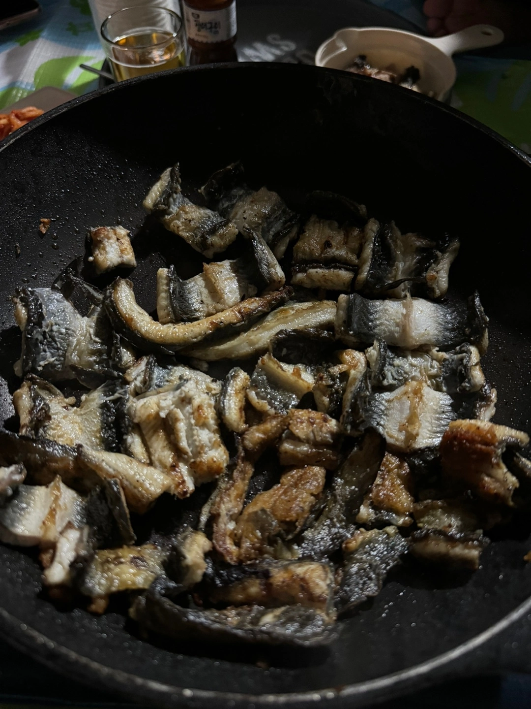 손질한 걸 지인집으로 가져와서 일단 숯불에 1차 초벌 했어요~ 그냥 프라이팬에 구워서 바로 먹어도 상관없다 하셨지만 이렇게 먹어야 더 맛있다고 구워 주시네요~ ㅎㅎ 그래서 더 담백했을까요? ㅎ